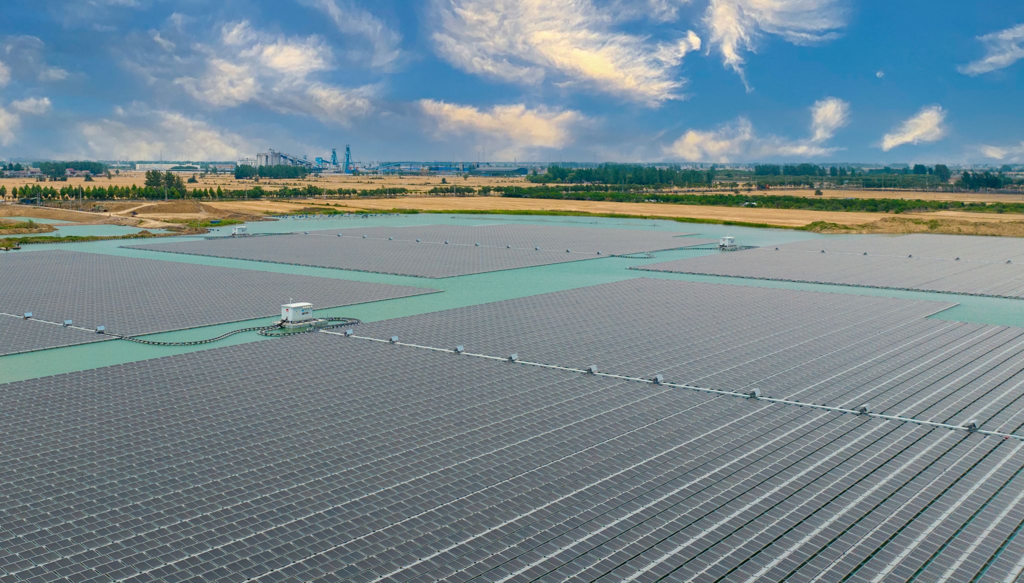 昔日的采煤沉陷區(qū),如今鋪滿(mǎn)藍(lán)色光伏板。孫疃32兆瓦、青東28兆瓦、袁一90兆瓦水面光伏電站,每年生產(chǎn)綠電1.6億千瓦時(shí),節(jié)省標(biāo)煤約5.09萬(wàn)噸,年減少二氧化碳排放13.74萬(wàn)噸。