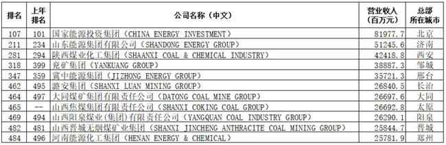 從中國(guó)上榜煤炭企業(yè)看,共有11家企業(yè)上榜,較上年凈增1家,山西焦煤集團(tuán)再次進(jìn)入500強(qiáng)名單。國(guó)家能源集團(tuán)、山東能源集團(tuán)、陜煤集團(tuán)繼續(xù)位列煤炭行業(yè)入圍企業(yè)三甲,兗礦集團(tuán)超過冀中能源集團(tuán)位列第四位,且其成為排名上升最快煤炭企業(yè)(上升81位)。11家企業(yè)中,國(guó)家能源集團(tuán),晉煤集團(tuán)位次略有下滑,其余企業(yè)排名位次均有所提升。