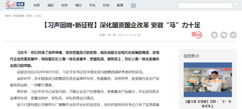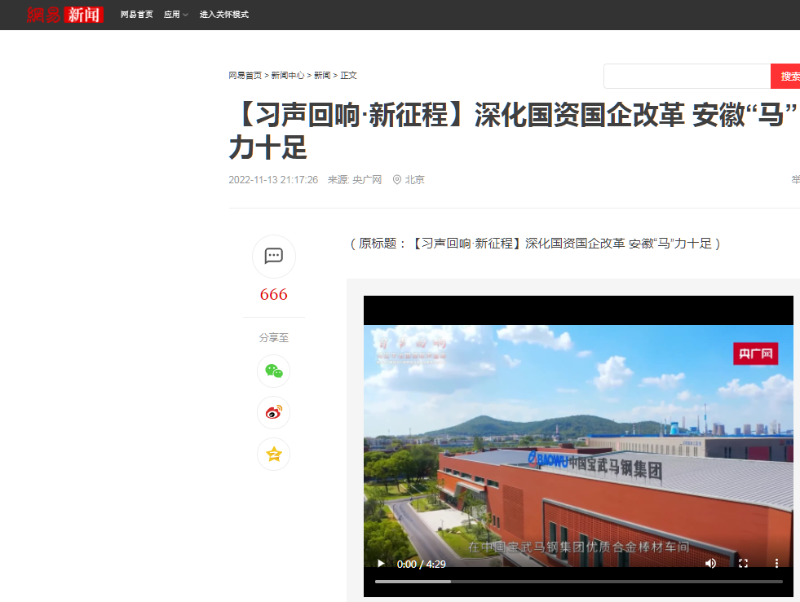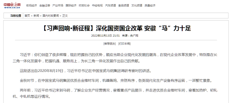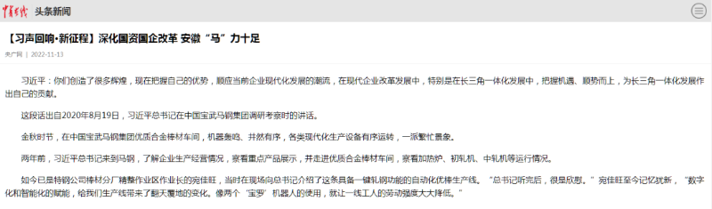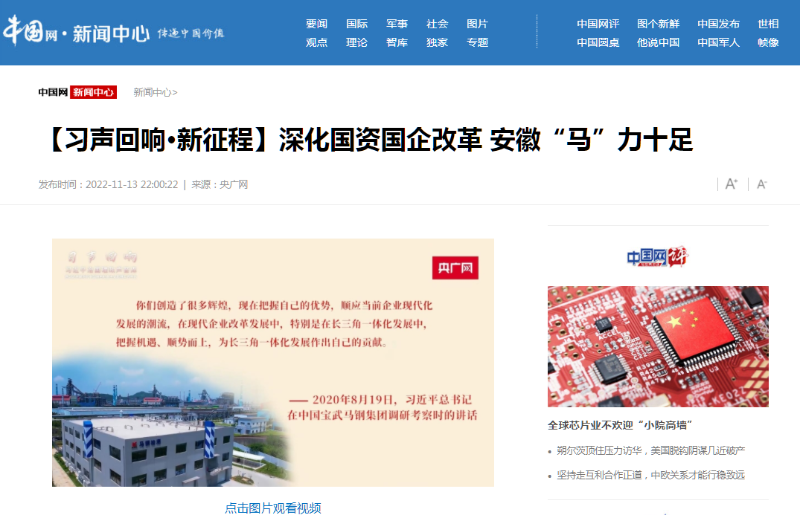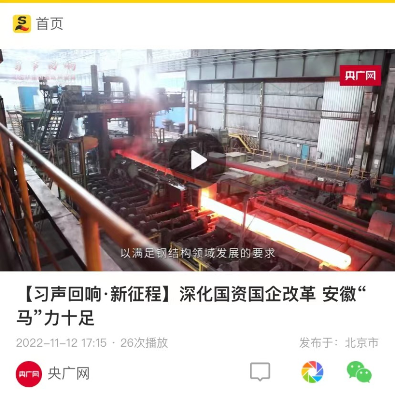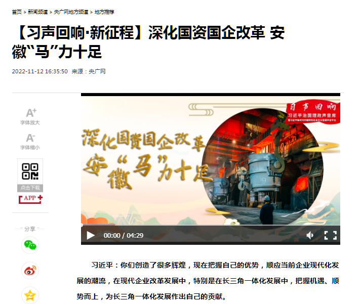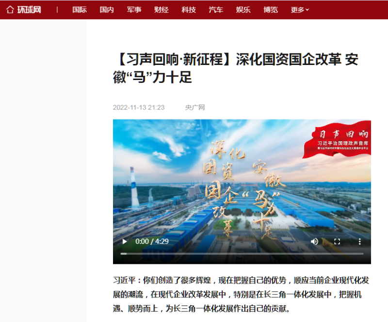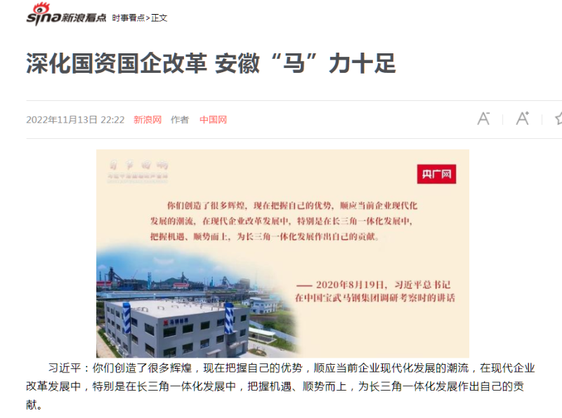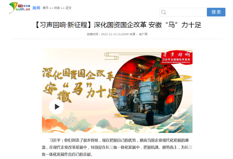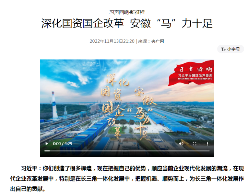 搶抓發(fā)展機(jī)遇,敢為時(shí)代先鋒。國(guó)企改革三年行動(dòng)以來(lái),安徽國(guó)資國(guó)企深化改革創(chuàng)新,不斷轉(zhuǎn)型突破,推動(dòng)省屬企業(yè)高質(zhì)量發(fā)展邁上新臺(tái)階。2021年,安徽省屬國(guó)有企業(yè)經(jīng)營(yíng)業(yè)績(jī)創(chuàng)歷史最好水平。今年上半年,省屬企業(yè)資產(chǎn)總額首次突破2萬(wàn)億元。目前,安徽省國(guó)企改革三年行動(dòng)的129項(xiàng)重點(diǎn)任務(wù)已基本完成。央廣網(wǎng)、人民網(wǎng)、中國(guó)網(wǎng)、中華網(wǎng)、光明網(wǎng)、環(huán)球網(wǎng)、中國(guó)經(jīng)濟(jì)網(wǎng)、中國(guó)青年網(wǎng)、中青在線、新浪網(wǎng)、網(wǎng)易網(wǎng)、騰訊網(wǎng)、搜狐網(wǎng)、鳳凰網(wǎng)等15家全國(guó)主流媒體及30余家省級(jí)主流媒體對(duì)此進(jìn)行了集中報(bào)道。